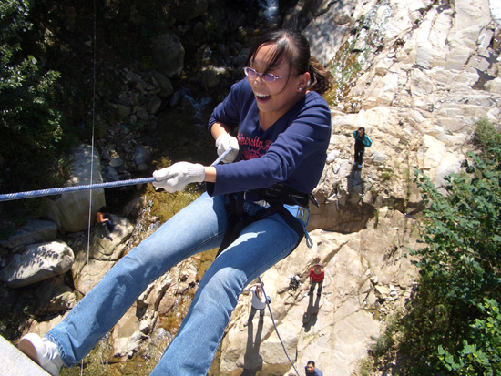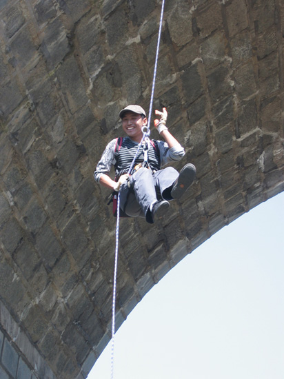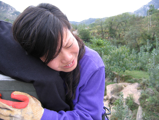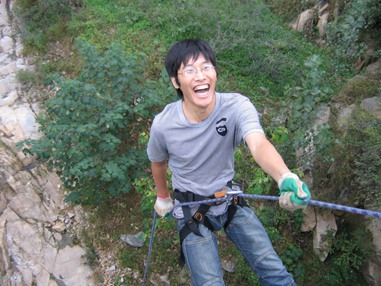第一個項目是速降,就是從幾十米高的地點(diǎn)跳下,當(dāng)然是要系安全帶的。我們采用的是坐式、主腰扣、八字環(huán)、手套……然后……跳下來……自己掌握下降的速度、落點(diǎn),以到達(dá)地面。速降并不需要嚴(yán)格的專業(yè)技巧,但只要開始下降,就無法退縮,必須克服恐懼與障礙、堅持到底。從自我激勵、自我控制到超越自我,最終走向成功。這是對自己極限的挑戰(zhàn),一開始有些同事不敢下降,但是看到好多人都已經(jīng)安全地下去了,也沉不住氣想要去嘗試一下了,最終在大家的鼓勵與隊長的指導(dǎo)下跳了下來,當(dāng)腳著地的那一刻,心中的恐懼、疑慮都已全部消散,取而代之的是戰(zhàn)勝自我的喜悅,那也是一種感動,為自己的成功而感動!