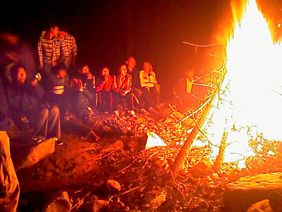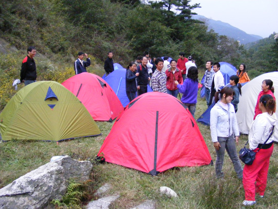 夜晚,小溪邊,我們?nèi)计鹆梭艋?,唱起大家熟悉的歌,每個人都被熊熊火焰感染著,臉上洋溢著成功的喜悅和輕松的歡愉。直到深夜,我們?nèi)跃镁貌辉鸽x開這暖暖的篝火?;氐綆づ瘢m然入秋的天氣已經(jīng)有了涼意,但每個人的心里都是暖的,疲倦和勞累,蕩然無存。帳篷外,泉水叮咚,蟲鳴草戲,帳篷內(nèi),笑聲不絕,竊竊絲語。
