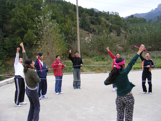 然后是經(jīng)典團(tuán)隊合作項目盲人方陣,所有的隊員被蒙上眼睛,在最短時間內(nèi),將一根繩子拉成一個最大的正方形,并且所有隊員都均分在四條邊上。這個項目難度很大,但是大家在一番爭論之后,很快就選出一位隊長來指揮安排,憑著感覺將這根長繩組成了一個正方形。其中該有的合作配合,該有的沉默聽從指揮,大家都完成的非常好。大家分享著這來自團(tuán)隊合作成功的喜悅,這也說明了我們這個團(tuán)隊是一個聽指揮、懂配合、有默契的優(yōu)秀團(tuán)隊。