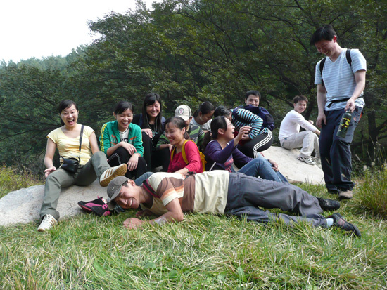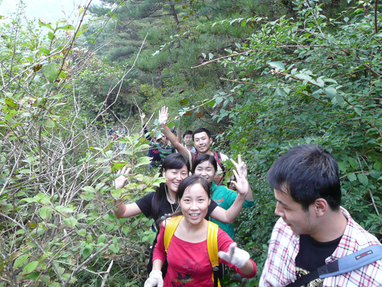 清晨的山峰全都彌漫在了朦朧的薄霧中,一番收拾之后,開始了我們的云峰之行。山路是崎嶇的,其實也算不上是條路,只是走的人多了而踩成的一條羊腸小道,有的地方需要手腳并用才能爬上去。一路上,大家相互你拉我一下,我推你一把,有難走的地方都是互相提醒注意腳下的路滑。有人想要放棄的時候,大家一齊鼓勵他,為他加油。我們當(dāng)中的每個人都被這種團(tuán)隊精神所感動。尤其是在最后攀巖的過程中,我們互相鼓勵,相互攙扶,硬是攀上了高十幾米的陡峭懸崖,到達(dá)峰頂。我們歡呼雀躍,盡情歡呼,享受“一覽眾山小”的喜悅。